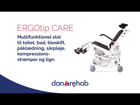 ERGOtip Care fremmer effektive hygiejne og baderutiner i en glidende bevægelse og sikrer samtidig en skånsom arbejdsstilling for hjælperen. Stolen er multifunktionel til toilet, bad, bleskift, påklædning, sårpleje, kompressionsstrømper og lign. Den udmærker sig ved en lille venderadius, der gør det nemt at bruge stolen i mindre rum og fremmer værdigheden for brugeren.